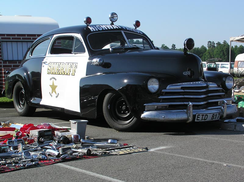 Ka müügikohtade vahel võis kohata huvitavaid sõidukeid, mille ülesandeks oli ostjate pilke pakutavale tõmmata - näiteks selline politseivärvides '47 Chevrolet.