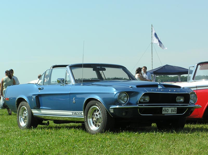 | Veel suuremaid haruldusi võis kohata Mustangite aedikus - kui tegu pole klooniga, siis on pildil '68 Shelby GT-500 Convertible, üks kõigest 402-st toodetud autost. '68 oli esimene mudeliaasta, kui lahtised Shelby Mustangid ametlikult saada olid. Tähtede KR puudumine mudelinimes näitab, et mootoriks pole aasta teises pooles välja tulnud 428 Cobra Jet, vaid tavaline Fordi 428, mida Shelby pisut täiustas. '68 autodel oli see ühe karburaatoriga '67 topeltkarburaatorite vastu ja võimsusreiting oli 360 hj. |